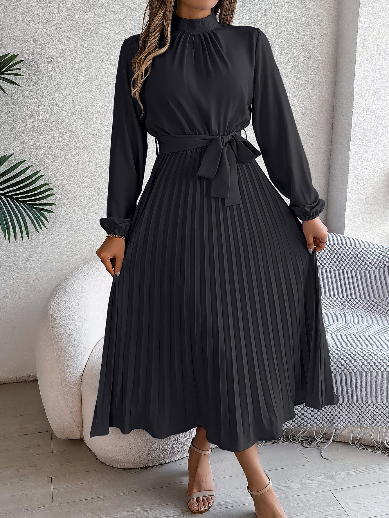 Elevate your wardrobe with this sophisticated maxi dress, designed for those who appreciate refined elegance. The structured stand collar and long sleeves create a polished silhouette, while the tie-waist cinches your figure for a flattering, defined shape. Cascading pleats from the waist add graceful movement and dimension, making this piece perfect for formal dinners, holiday celebrations, or upscale events. Crafted with premium attention to detail, this dress transitions seamlessly from sophisticated gatherings to special occasions where understated luxury speaks volumes.