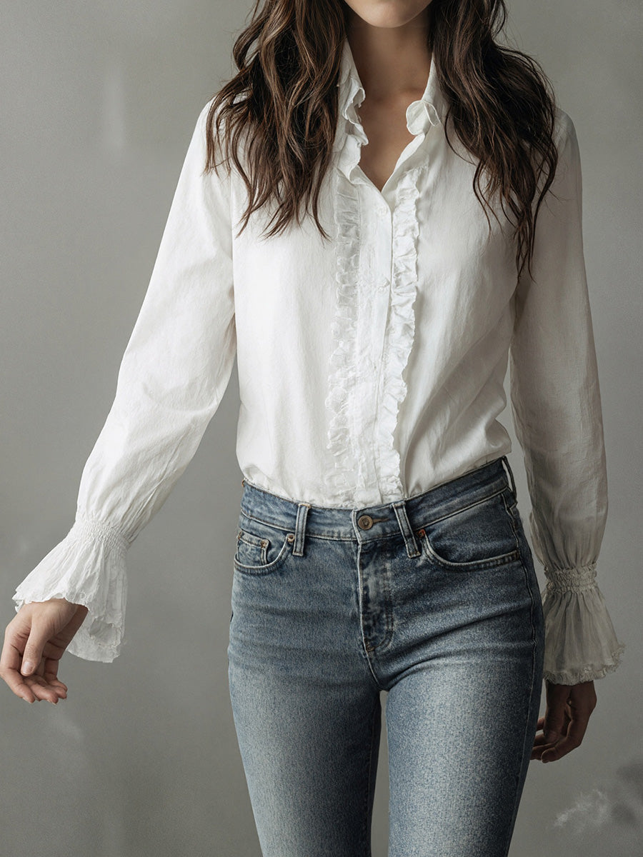 Elevate your wardrobe with this charming long-sleeved ruffled blouse, designed to add effortless elegance to any outfit. The delicate ruffled detailing creates a romantic, eye-catching silhouette that flatters your figure while the long sleeves provide versatile coverage for year-round styling. Perfect for dressing up casual jeans or layering under your favorite blazer, this blouse transitions seamlessly from office to evening occasions. The thoughtful construction ensures comfort throughout the day, making it an essential piece that works harder than it looks. Invest in a timeless staple that brings sophistication and personality to your everyday style.